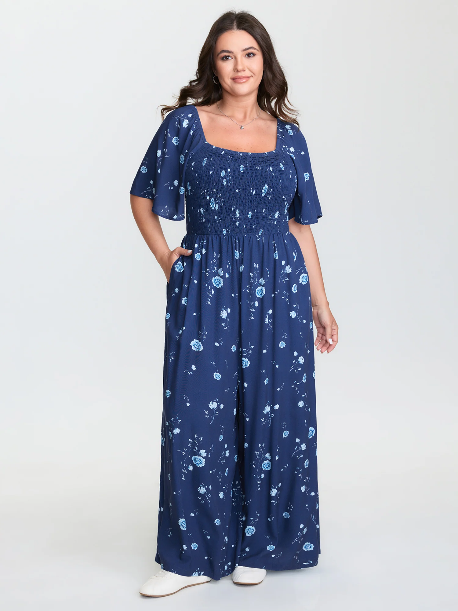 Breezy Floral Print Shirred Bodice Jumpsuit