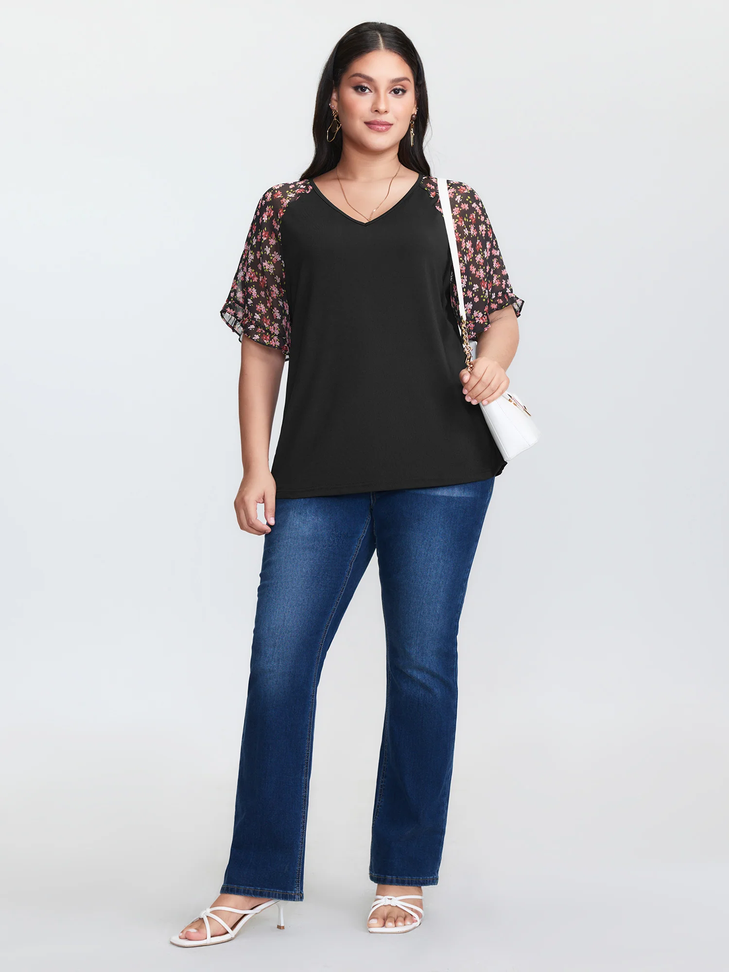 Sheer Floral Print Ruffled Cuff Sleeve Top